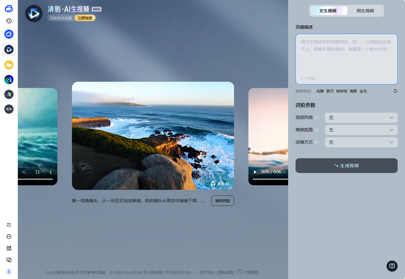 - 视频生成:智谱清影具备强大的AI视频生成能力,支持文生视频和图生视频两种模式。